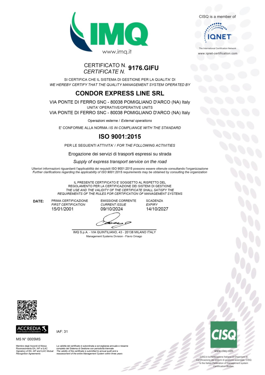 Dal 2021, il Sistema di Gestione della Qualità di Condor Express Line è certificato conforme agli standard della norma UNI EN 9001:2015.